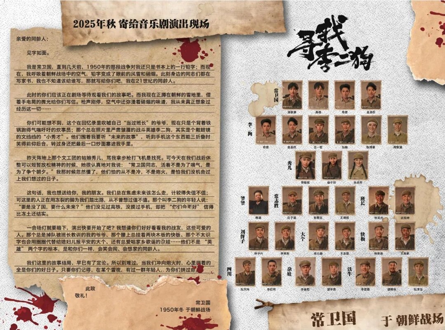作品以中国人民志愿军第三十九军一一六师的真实战史为背景,以“和平万岁”勋章为情感线索,借助“穿越”叙事架起历史与当下的对话桥梁。《寻找李二狗》打造“不一样的主旋律”,构筑起中国音乐剧的新式英雄叙事。首演以来,该剧走过12座城市、39场演出;以原创舞台IP实现微博相关话题阅读量突破1.5亿,大麦评分9.8分,荣获2025微博文化之夜“年度突破演出IP”。